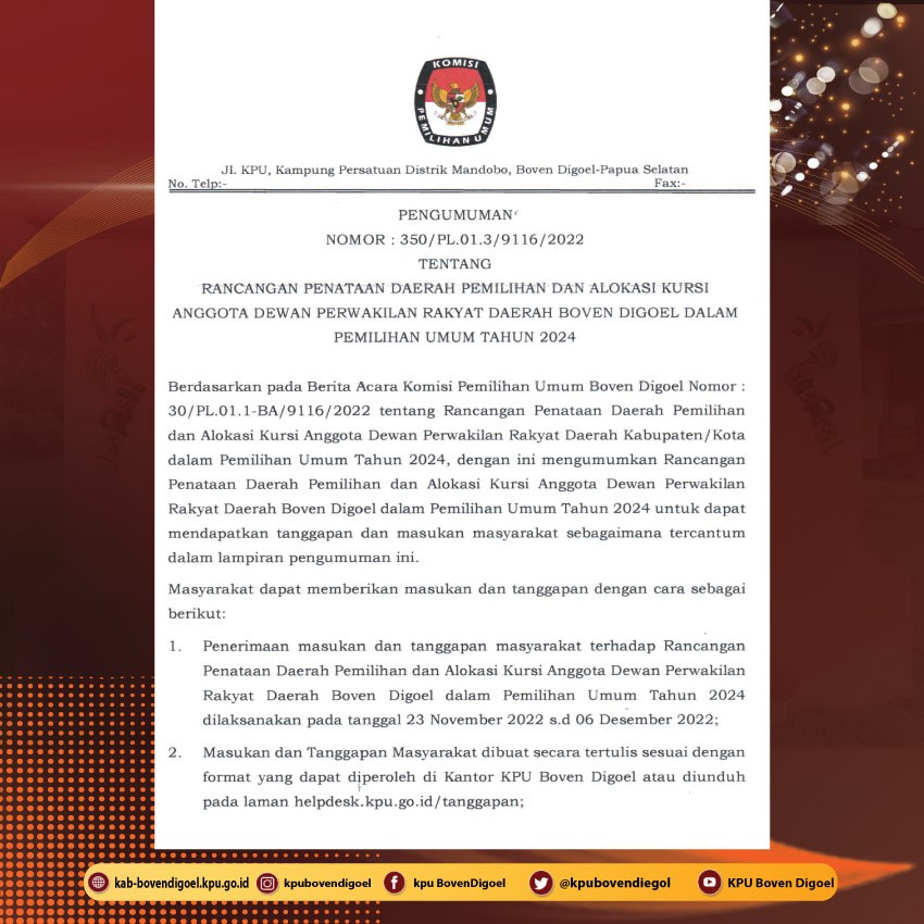 #TemanPemilih KPU Boven Digoel mengumumkan Nomor 350/PL.01.3/9116/2022 Tentang Rancangan Penataan Daerah Pemilihan Dan Alokasi Kursi Anggota Dewan Perwakilan Rakyat Daerah Boven Digoel Dalam Pemilihan Umum Tahun 2024.
