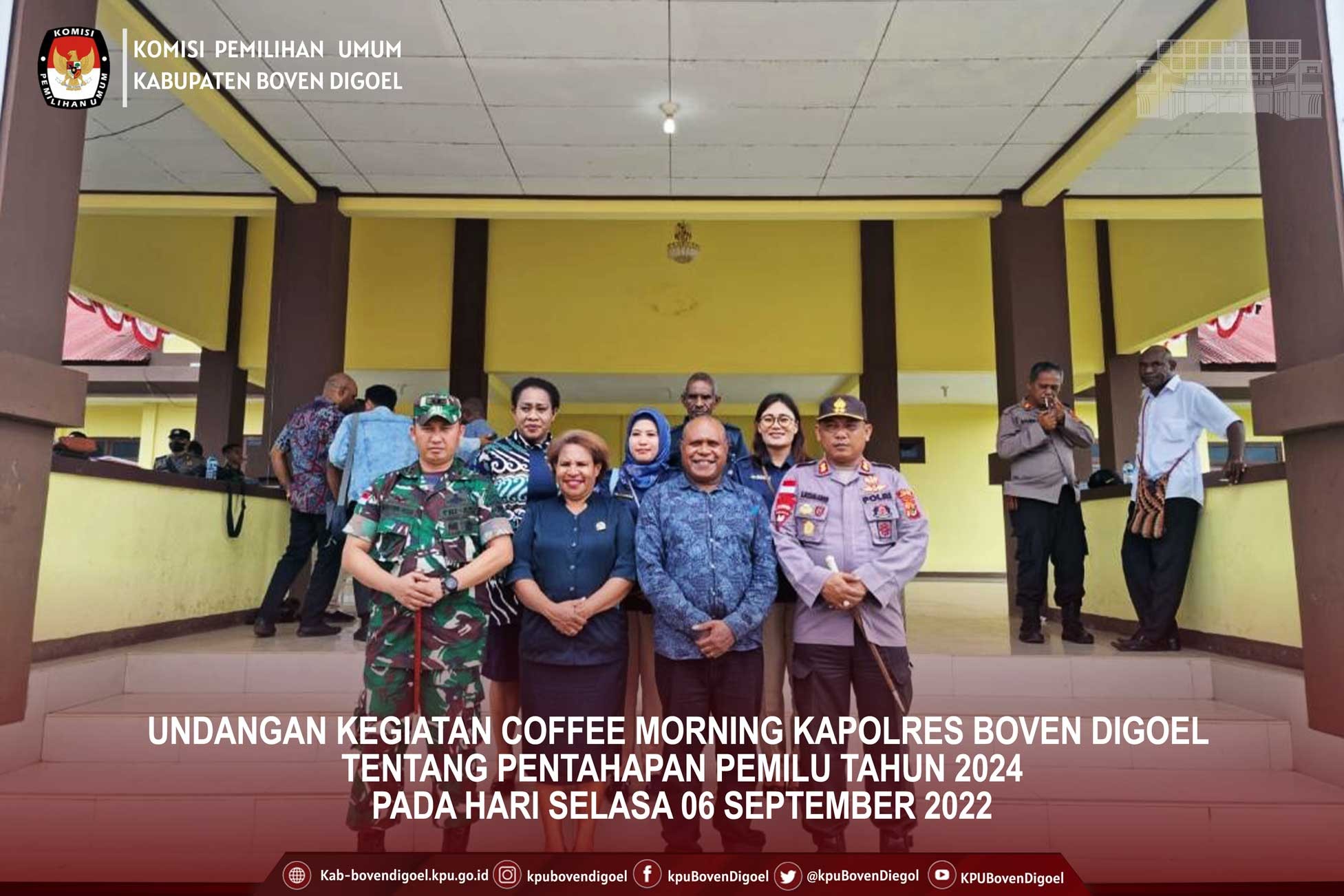 KPU Boven Digoel beserta KPU Provinsi Papua menghadiri Undangan Coffee Morning Kapolres Boven Digoel tentang Pentahapan Pemilu Tahun 2024 di Kapolres Boven Digoel pada hari Selasa tanggal 06 September 2022.