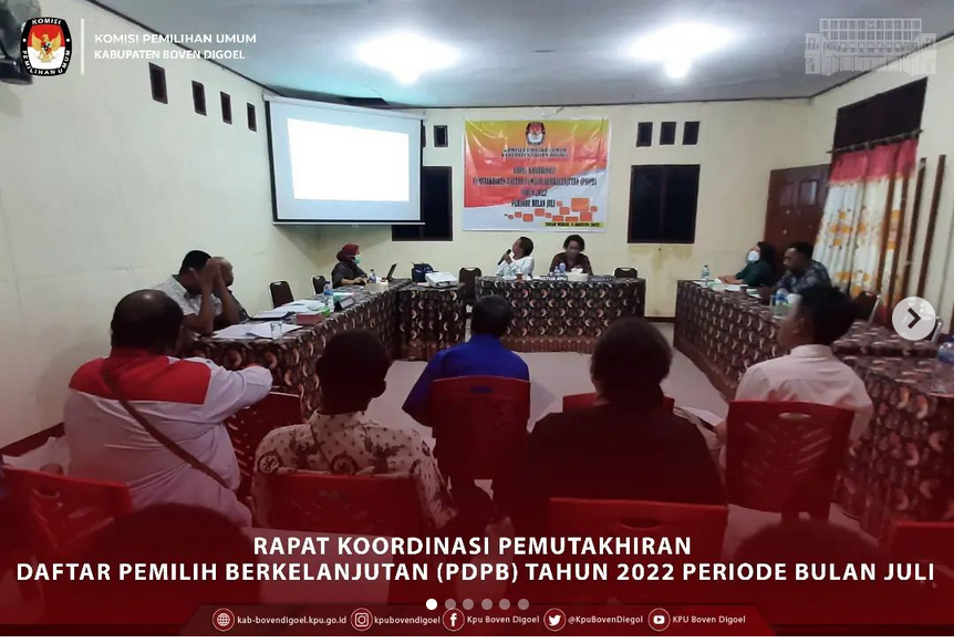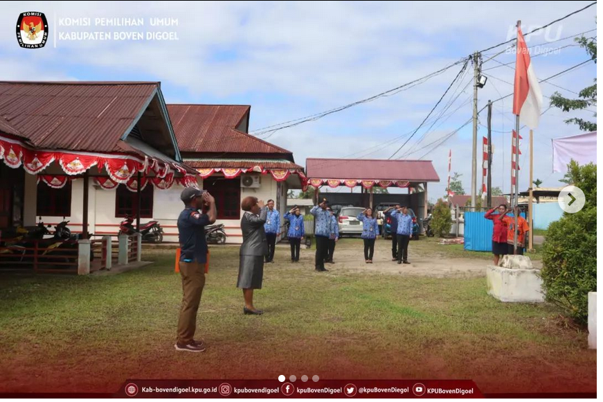 KPU BOVEN DIGOEL MELAKSANAKAN UPACARA MEMPERINGATI HUT RI KE 77 TAHUN 2022 DAN PERLOMBAAN 17 AGUSTUS DI KPU BOVEN DIGOEL #Teman Pemilih KPU Boven Digoel melaksanakan Upacara dalam memperingati HUT RI yang Ke 77 Tahun 2022 pada hari Rabu tanggal 17 Agustus 2022 bertempat di Kantor KPU Kabupaten Boven Digoel. Didalam upacara berlangsung adanya Naskah Sambutan dari ketua KPU RI yang dibacakan oleh Ketua KPU Boven Digoel Ibu Helda Richarda Ambay selaku Inspektur Upacara. Sesuai logo HUT RI ke-77 2022 yang mengusung tema "Pulih Lebih Cepat Bangkit Lebih Kuat". Penentuan tema HUT RI ke-77 2022 ini punya dasar-dasar yang kuat, khususnya kejadian yang melanda Indonesia dan dunia dalam dua tahun terakhir ketika terjadi pandemi Covid-19. Meski tengah terpuruk akibat pandemi Covid-19, semua elemen bangsa bergerak bersama dan bergotong royong untuk mewujudkan harapan. Selain itu, semangat gotong royong itu bertujuan untuk mencapai percepatan pemulihan kondisi di semua sektor agar Indonesia siap menghadapi tantangan global. Oleh karena itu, HUT RI ke-77 2022 merefleksikan nilai-nilai Pancasila dan Bhinneka Tunggal Ika yang mempersatukan Indonesia. Dasar-dasar negara tersebut menuntun bangsa Indonesia untuk bersama pulih lebih cepat agar siap menghadapi tantangan global dan bangkit lebih kuat untuk siap membawa Indonesia maju. HUT Kemerdekaan Tahun ini, disambut dengan rangkaian pelaksanaan Tahapan Pemilu dan Pilkada Serentak Tahun 2024, dimana tahapan pemilu telah dimulai sejak tanggal 14 Juni 2022 yang lalu dan baru saja menyelesaikan pendaftaran partai politik pada tanggal 14 Agustus 2022 dengan dilanjutkan dengan verifikasi administrasi dan faktual. Kemudian dalam momen memeriahkan Hari Kemerdekaan HUT RI yang ke 77 KPU Boven Digoel memeriahkan dengan beragam lomba. Tujuan lomba ini adalah untuk kekompakan dilingkungan KPU Boven Digoel serta dalam berlangsungnya tahapan Pemilu Serentak 2024 yaitu untuk bersatu padu dan taat satu komando demi menyukseskan setiap tahapan Pemilu Serentak 2024 khususnya dilingkungan KPU Boven Digoel. Adapun beberapa lomba yang dilaksanakan 17 Agustus yaitu makan kerupuk, balap karung, Joget Balon, Dandan berdaster dan yang tidak kalah seru adalah fashion Show KPU Boven Digoel dengan menggunakan Daster yang diikuti oleh perserta staf laki-laki di KPU Boven Digoel. #KPUMelayani;#KPUBovenDigoel;#PemilihanSerentak2024