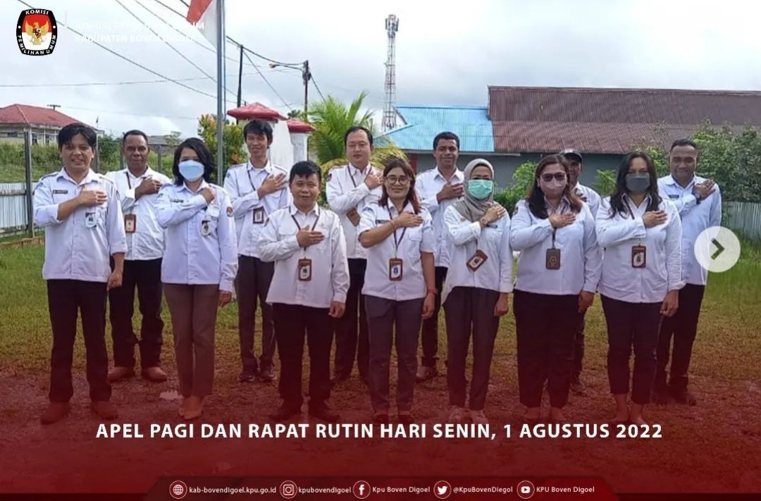 KPU Kabupaten Boven Digoel melakukan kegiatan Apel Pagi dan Rapat Rutin hari Senin, 1 Agustus 2022 yang dipimpin oleh Sekretaris KPU Boven Digoel Ibu Ina Martina, SE yang diikuti oleh para Kasubbag dan Staf kesekretariatan baik PNS maupun PPNPN.